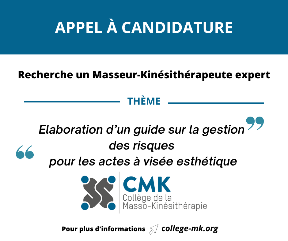 Le Collège de la Masso-Kinésithérapie recherche des Masseurs-Kinésithérapeutes experts, en vue de répondre à une demande de la Haute Autorité de santé (HAS) qui élabore actuellement un guide méthodologique de gestion des risques des actes à visée esthétique (hors actes chirurgicaux). Ce travail a pour objectif la sécurisation des pratiques, l’harmonisation de leur encadrement et la mise à disposition d’outils partagés.